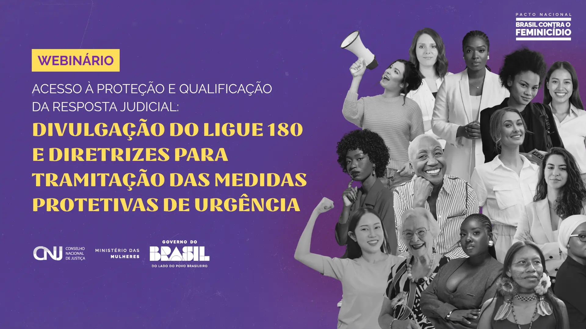 Inscrições gratuitas: https://eventos.cnj.jus.br/inscricao-webinario-acesso-a-protecao-e-qualificacao-da-resposta-judicial-divulgacao-do-ligue-180-e-diretrizes-para-tramitacao-das-medidas-protetivas-de-urgencia