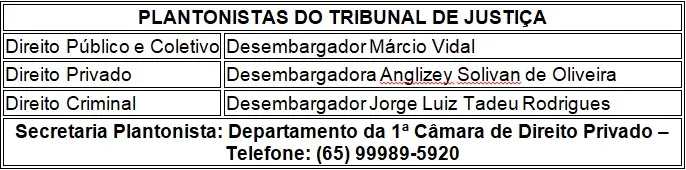 Para atendimento das medidas urgentes de Saúde Pública, de competência da 1ª Vara Especializada da Fazenda Pública de Várzea Grande, o Tribunal de Justiça de Mato Grosso disponibilizou o telefone (65) 99202-6105, para atendimento das medidas de plantão, que se inicia a partir das 19h desta sexta-feira até o início do expediente seguinte, na segunda-feira (12h).