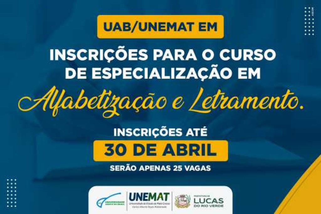 A Universidade Aberta do Brasil (UAB), polo de Lucas do Rio Verde, está com inscrições abertas para o curso especialização em Alfabetização e Letramento. A pós-graduação, ofertada pela Universidade do Estado de Mato Grosso (Unemat), é gratuita e será realizada na modalidade de Educação a Distância (EaD).