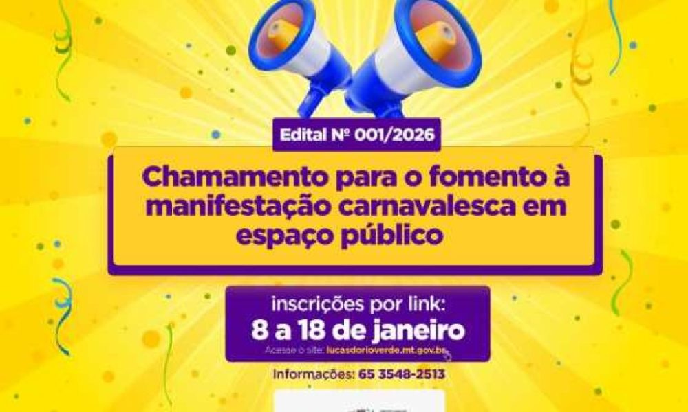 A Secretaria Municipal de Cultura e Turismo de Lucas do Rio Verde abre inscrições para o Edital nº 001/2026, voltado ao fomento de manifestações carnavalescas em...