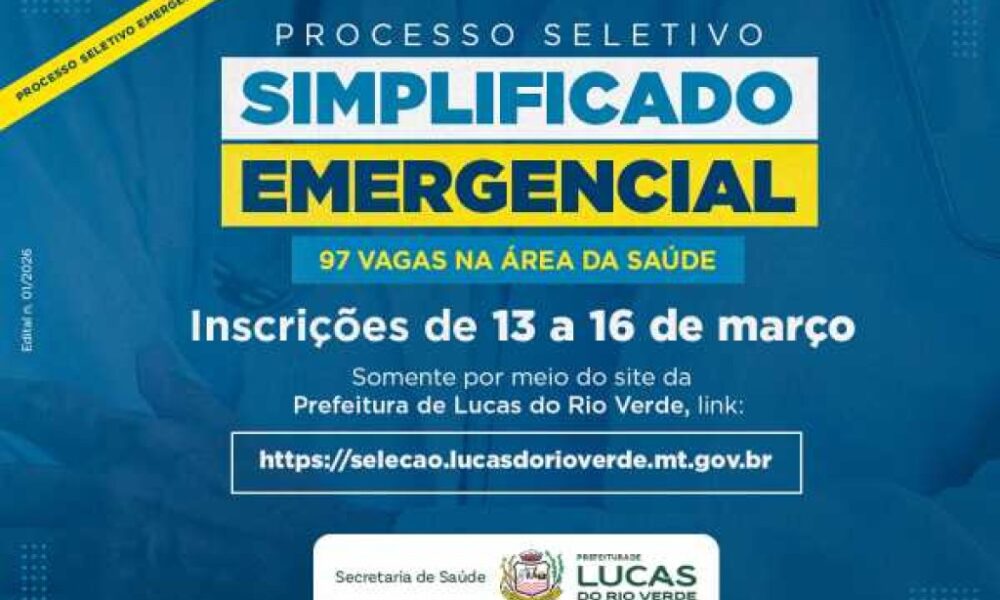 Começam nesta sexta-feira (13), as inscrições para o Processo Seletivo Simplificado Emergencial, Edital n. 01/2026, aberto pela Prefeitura de Lucas do Rio Verde. São ofertadas 97...